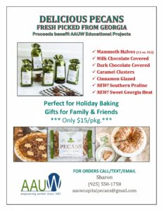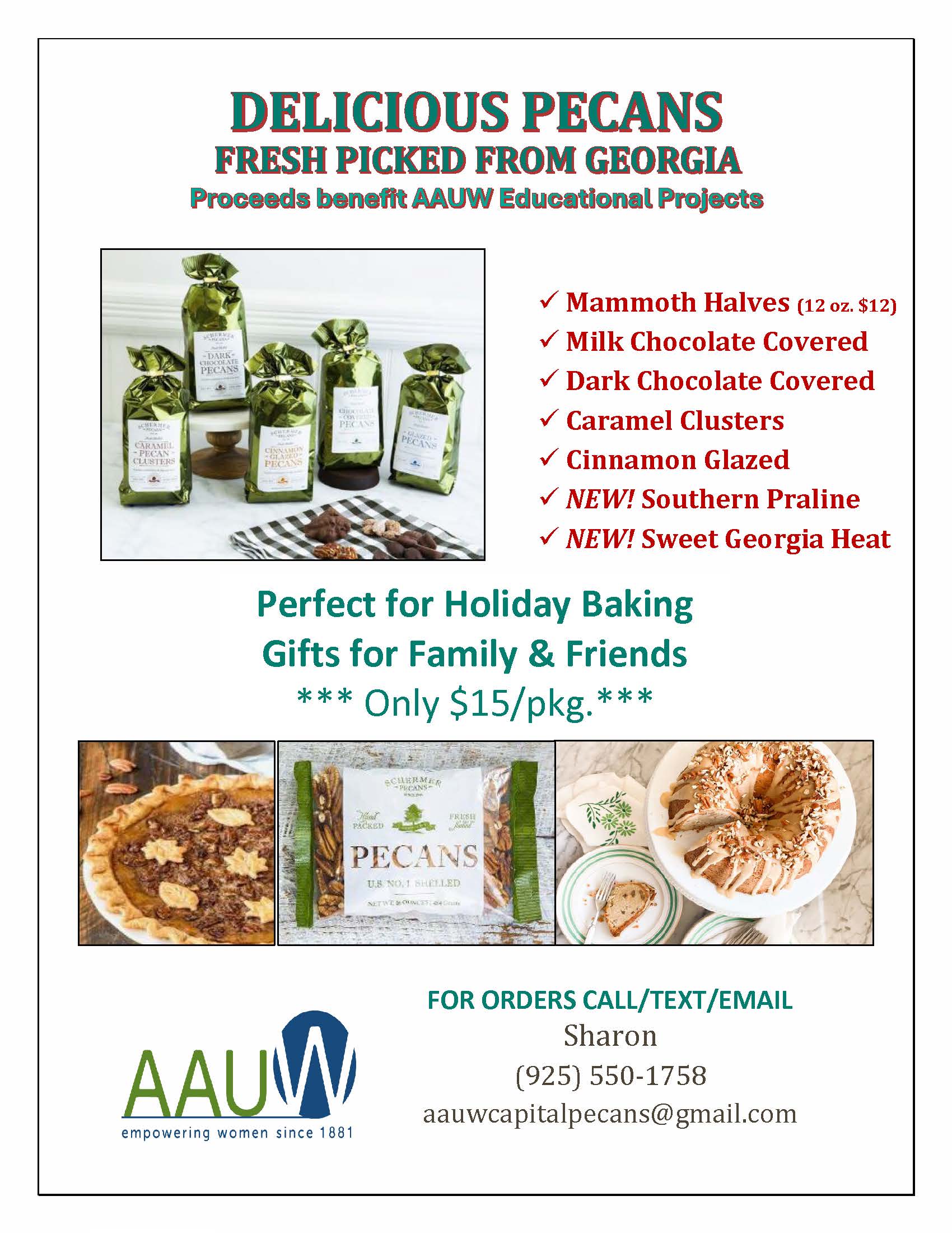 Every fall the Capital Branch sells amazing, fresh-picked pecans from Schermer Pecan Company in Georgia. These superior pecans are delicious plain for salads and baking, or as gift-packaged candies ready for the holiday season, including Fancy Mammoth Halves, Chocolate/Dark Chocolate Covered, Cinnamon Glazed, Caramel Clusters, Southern Praline, and Sweet Georgia Heat. These specialty pecans are attractively packaged and make the perfect holiday treat for friends and family. For more information, please email aauwcapitalpecans@gmail.com.
